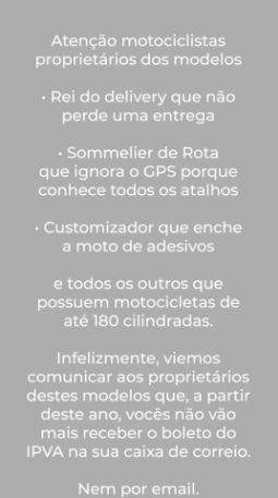 - A isenção vale somente para motocicletas, ciclomotores ou motonetas com cilindrada até 180cc (180 cm³), conforme informado no documento do veículo.