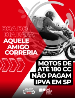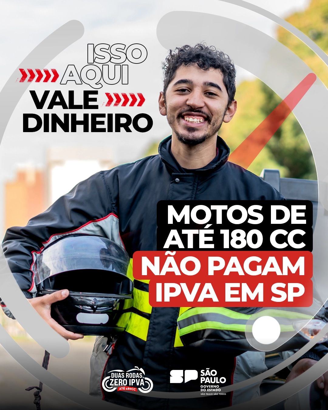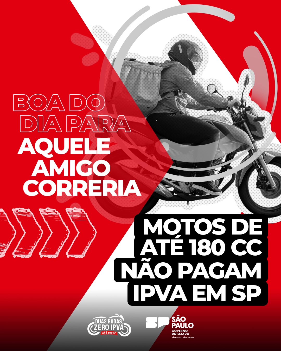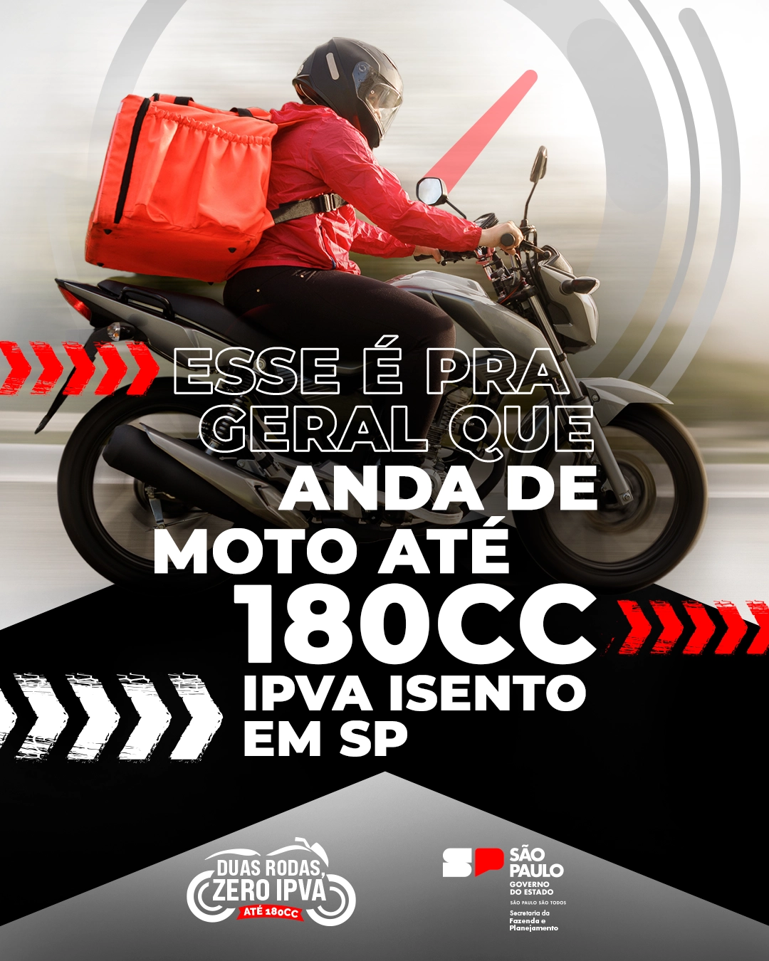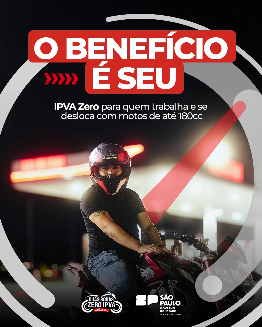 Inédita no Sudeste, a iniciativa reconhece a importância de quem movimenta a economia sobre duas rodas. Para milhares de entregadores e trabalhadores, economizar o IPVA significa menos imposto, mais dinheiro no bolso de quem acelera todo dia para fazer o corre acontecer.